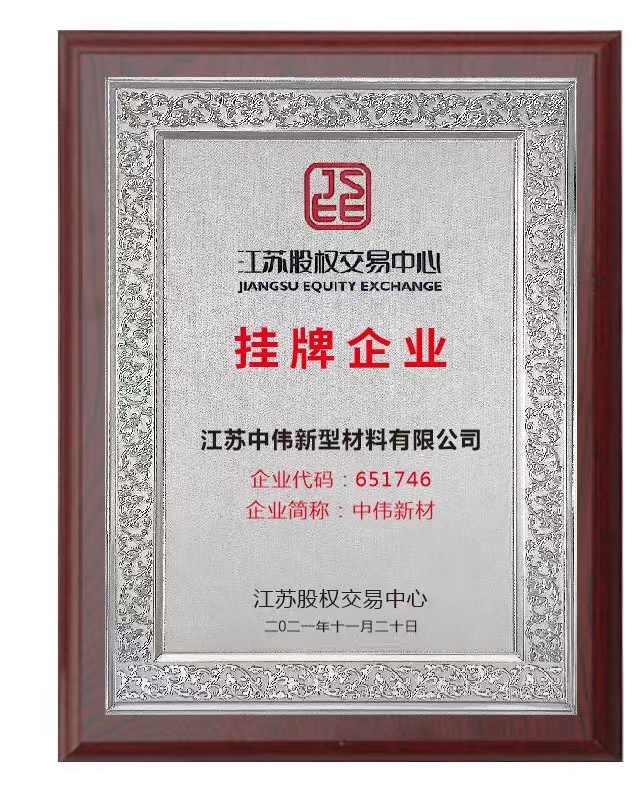 2021年11月20日 ,江蘇中偉新型材料有限公司在江蘇股權(quán)交易中心掛牌成立,標(biāo)志著江蘇中偉新材在走向國(guó)際化、專業(yè)化的道路上邁出了跨越性的一步。