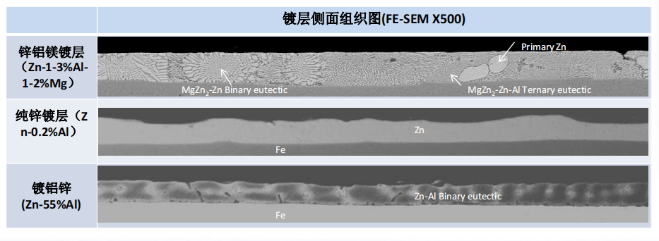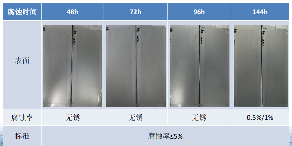試驗樣品:在同樣實驗條件下純鋅鍍層重量為100g/m2,鋅鋁鎂鋅鋁鎂鍍層重量為70 g/m2 ,鋅鋁鎂鍍層產(chǎn)品表現(xiàn)出更優(yōu)的平面耐腐蝕性能。