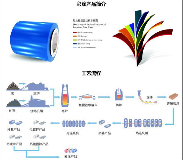 彩涂產(chǎn)品基板類型主要包括熱鍍鋅、鍍鋁鋅、電鍍鋅、冷軋板,面漆種類包括普通聚酯、硅改性聚酯、高耐候聚酯、氟碳等,鋼種也較為齊全,有一般成型、沖壓、深沖壓和高強結(jié)構(gòu)等全系列品種。主要應(yīng)用于建筑、家電等行業(yè),寶鋼是目前中國規(guī)模大、品種齊全的彩涂板生產(chǎn)基地。