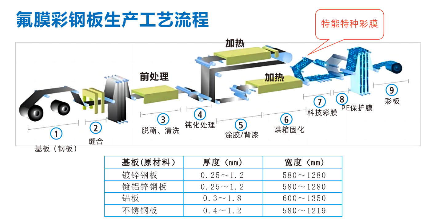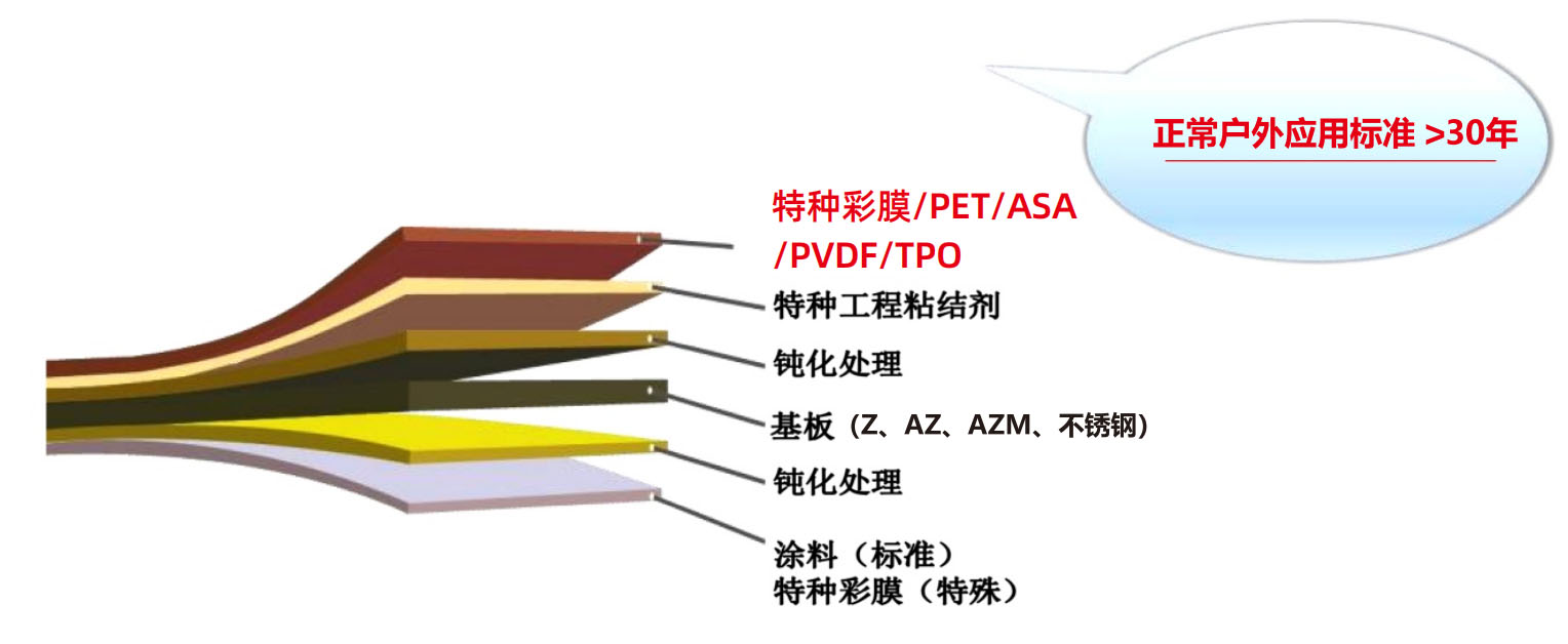 覆膜防腐彩涂卷采用了結(jié)構(gòu)膜增強(qiáng)復(fù)合改性材料結(jié)構(gòu)技術(shù) ,且產(chǎn)品結(jié)構(gòu)富含鋁鉑金屬成分。面膜結(jié)構(gòu)具有極強(qiáng)的表面耐老化、耐腐蝕、耐化學(xué)、 100%阻隔率等特殊優(yōu)異性能 ,彩板結(jié)構(gòu)具有超強(qiáng)的電化學(xué)保護(hù)機(jī)理的耐腐蝕性能 ,可無(wú)限提升彩板基板的斷口腐蝕標(biāo)準(zhǔn)。同時(shí)保持了鋼板的屈服強(qiáng)度、硬度等安全性能。產(chǎn)品深加工成型性能好 ,能滿足不同的個(gè)性化深加工要求。